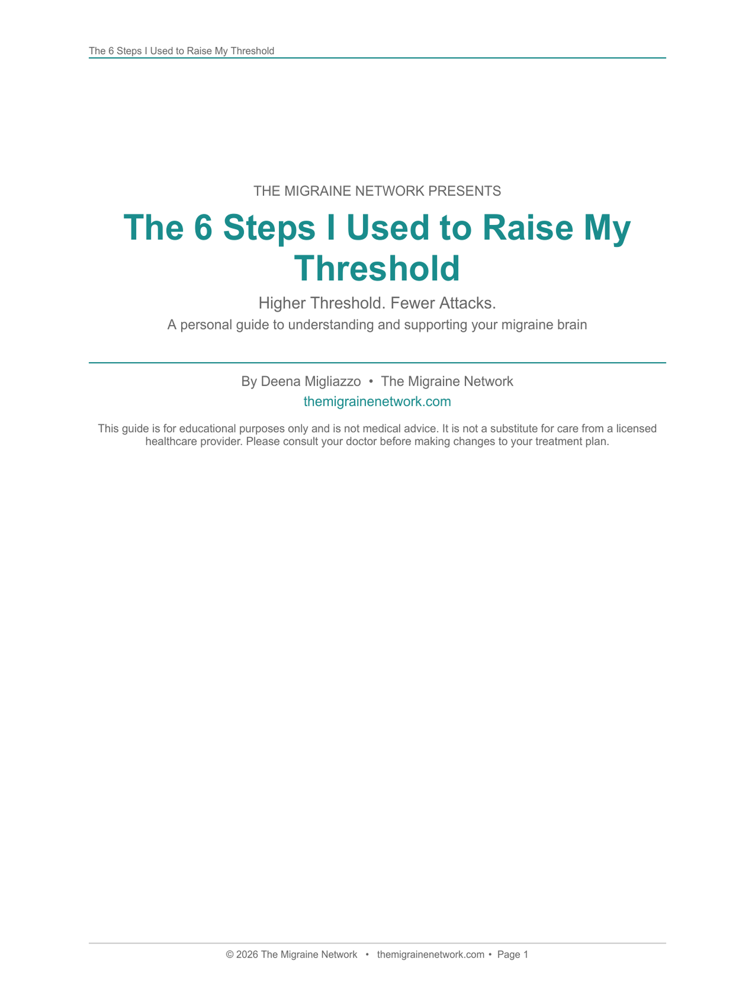 Think of your brain like a cup that fills with daily stressors — poor sleep, skipped meals, bright lights, stress, weather changes. When the cup overflows, a migraine attack starts. Your threshold is the size of that cup. A higher threshold means more capacity before an attack is triggered. The Guide teaches you six concrete steps to make your cup bigger so everyday triggers are less likely to push you over the edge.