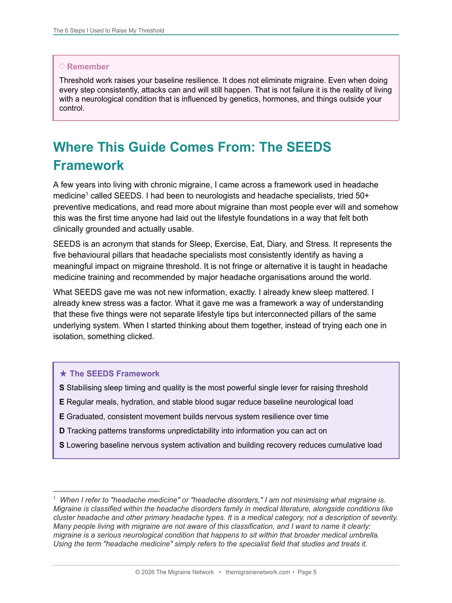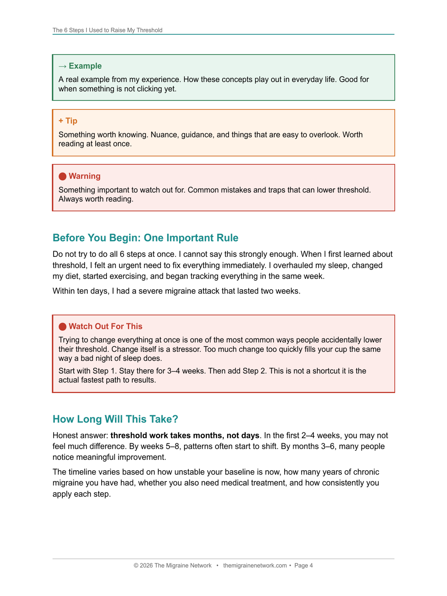 The Guide teaches you the migraine threshold concept — think of your brain like a cup that fills with daily stressors. When it overflows, an attack starts. Six concrete steps help you make that cup bigger: sleep, meals, movement, tracking, stress, and planning.